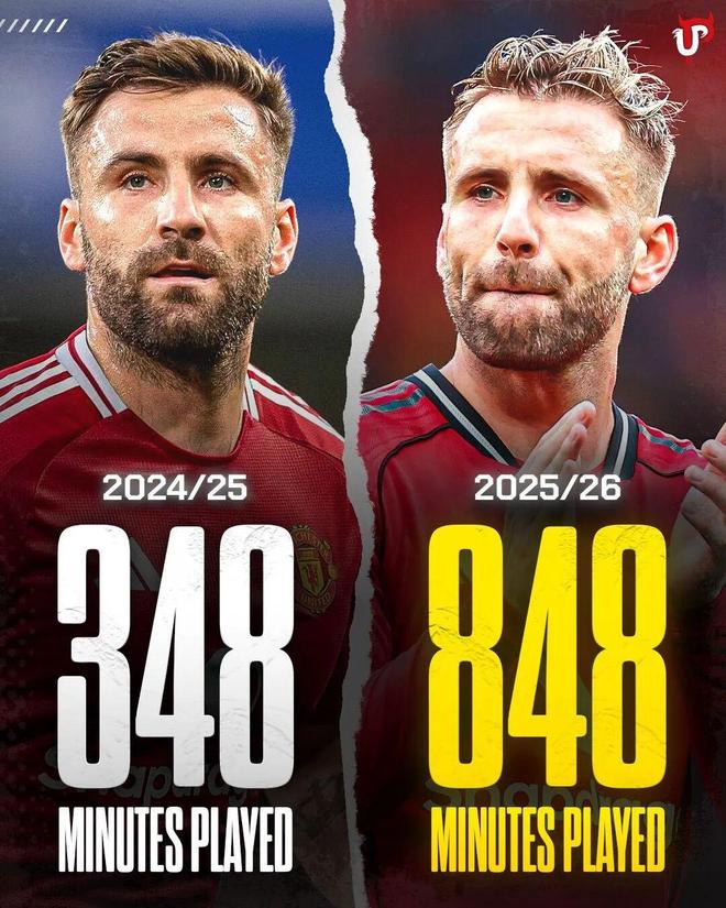 卢克·肖上赛季总共出场348分钟,本赛季已出战848分钟