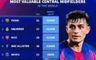 德转列中前卫身价榜:佩德里1.4亿欧居首,巴尔韦德第二 -